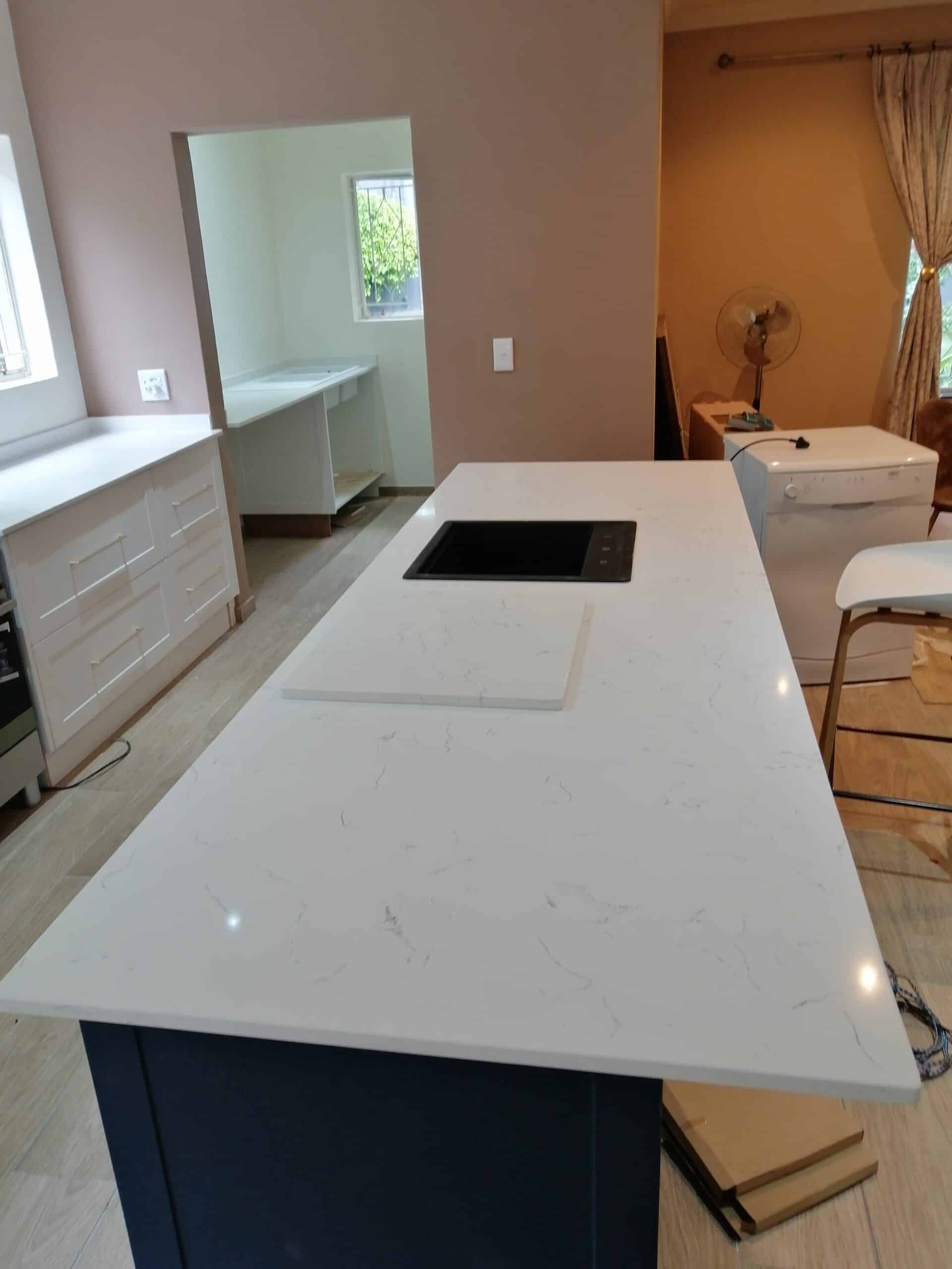 Eezi Quartz whisper kitchen countertop, this is a popular white stone with dark or black lines.